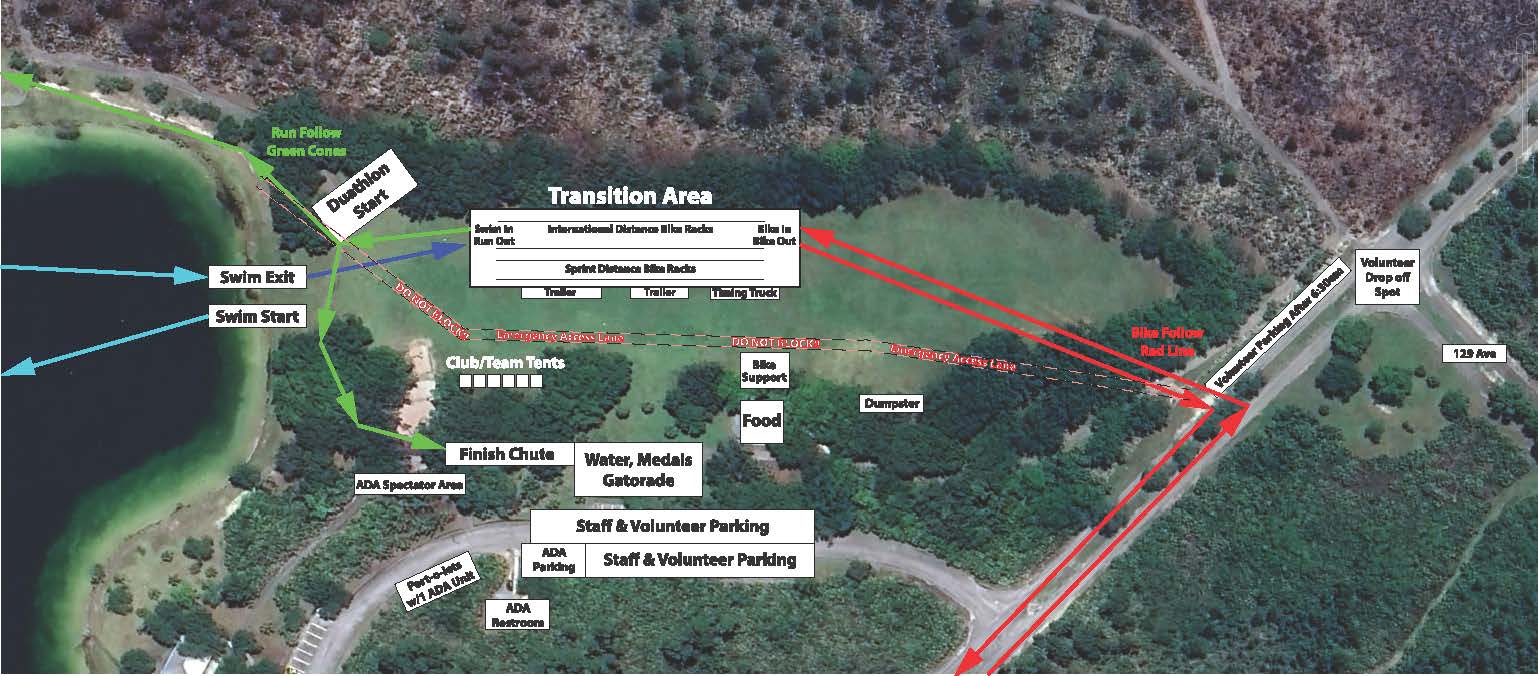 Duathletes will run a quick 1 mile out-and-back next to the lake before jumping on their bikes.
